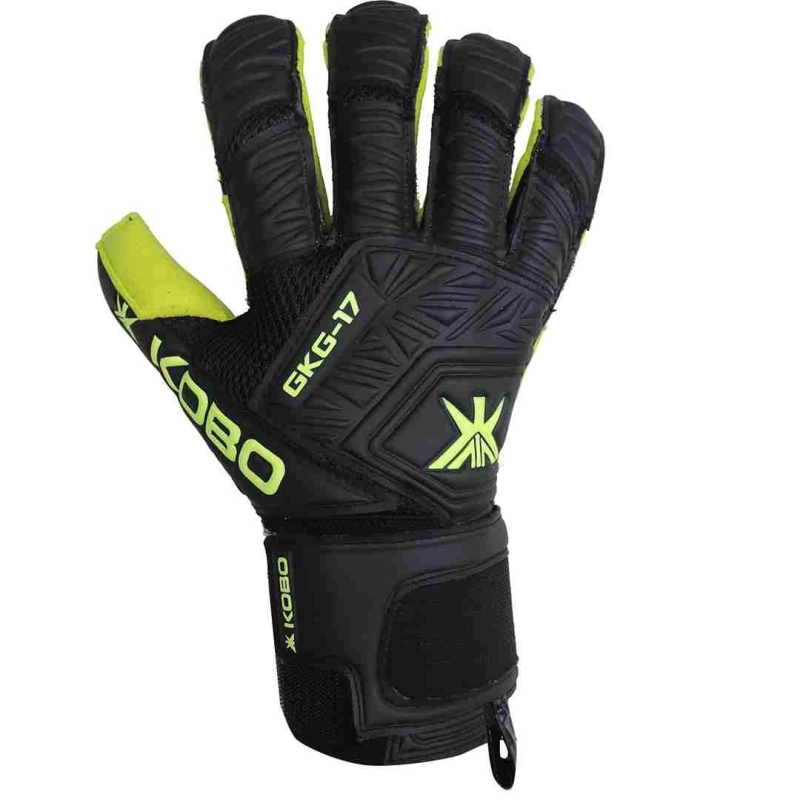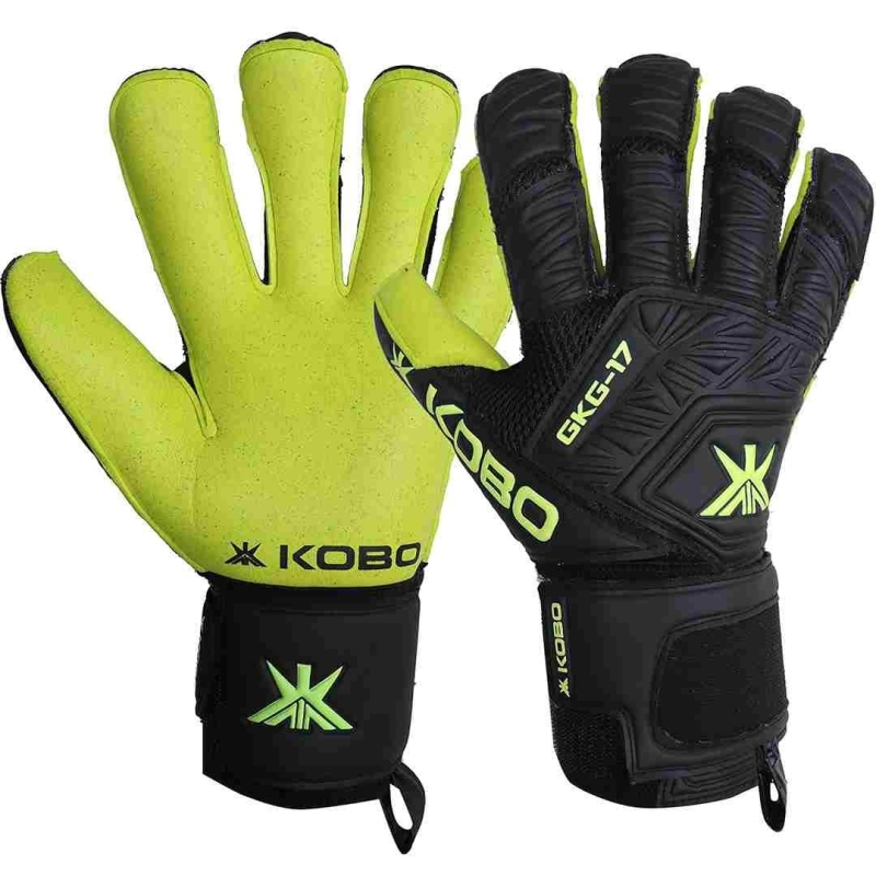 These Kobo Goalkeeper Gloves are designed for competitive football and soccer players, offering superior grip with a German Quartz latex palm, enhanced protection through an improved finger-save system, and excellent comfort with a breathable, padded backhand. The adjustable wrist strap ensures secure support, making them ideal for adult goalkeepers seeking performance and durability.