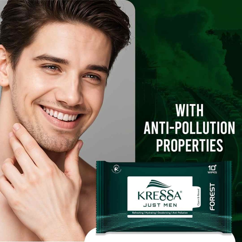 KRESSA Refreshing Face Wipes for Men are biodegradable, alcohol-free, paraben-free wipes designed to instantly cleanse, hydrate, and refresh the skin. Enriched with Witch Hazel extract and a woody forest fragrance, they effectively remove dirt, impurities, and pollution—ideal for men on the go, outdoor enthusiasts, and daily use.