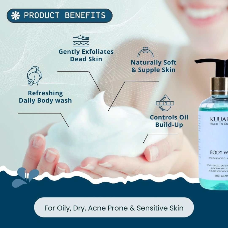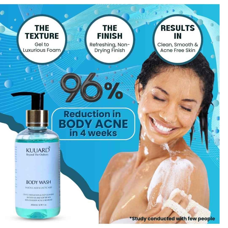Kuuard Exfoliating body wash with Salicylic Acid, Lactic Acid, Tea Tree, and Sweet Almond Oil that helps remove dead skin, prevent body acne, reduce bumps, and deeply cleanse pores while keeping skin smooth and hydrated. Suitable for all skin types and regular use.