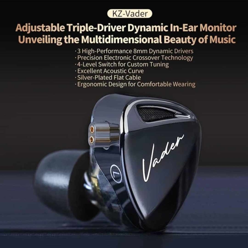 The KZ Vader (Balanced with Mic) from Concept Kart is a premium in-ear monitor (IEM) equipped with triple 8mm dynamic drivers for high-resolution, three-frequency balanced audio. It features an in-line microphone, professional electronic filters, and a detachable silver-plated cable, offering both exceptional sound clarity and convenient call management. Designed for immersive music listening, recording, and everyday use, the Vader delivers a detailed, distortion-free soundstage in a durable and comfortable form factor.