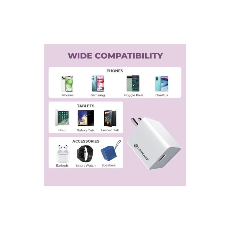The Lapcare LWC-654 is a compact 30W fast-charging USB wall adapter designed for smartphones, tablets, laptops, and other digital devices. Built with advanced safety features including short-circuit, over-voltage, temperature, and current protection, it ensures safe and efficient charging. Its lightweight and travel-friendly design, along with wide fast-charging compatibility and high-quality copper components, makes it a reliable everyday charging solution.
