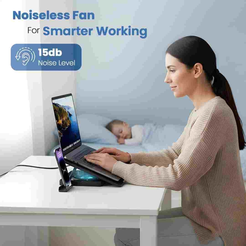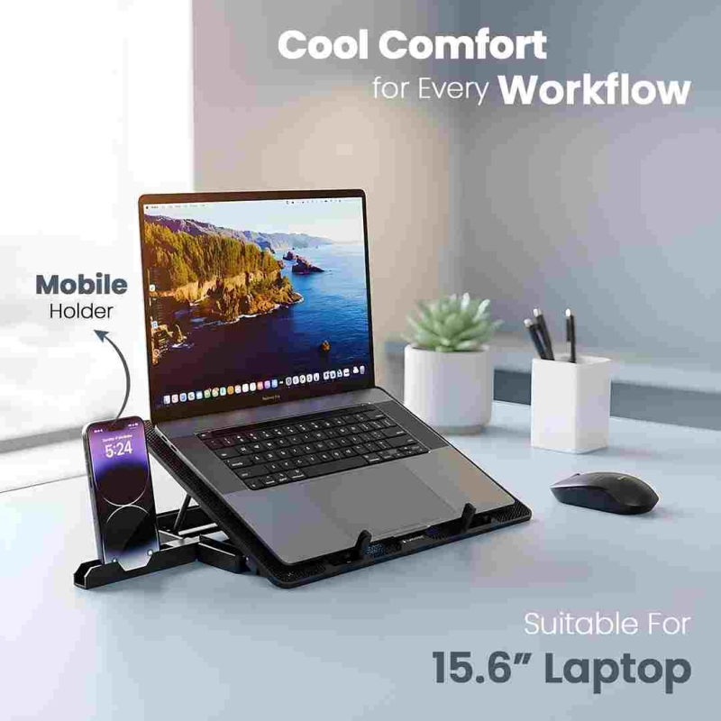 The Lapcare ChillMate DCX-A101 Laptop Cooling Stand is a lightweight and portable cooling solution for laptops up to 15.6 inches. Featuring dual 12.5 cm high-speed fans (1000 RPM), 5 adjustable ergonomic height levels, ultra-quiet 15 dB operation, metal mesh surface for maximum airflow, dual USB ports, and a detachable mobile stand, it ensures effective heat dissipation and comfortable usage during work, gaming, or streaming.