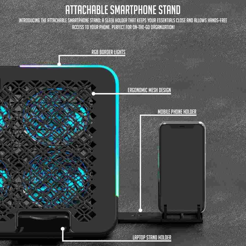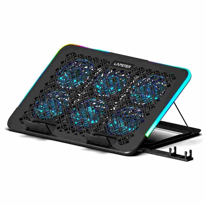 The LS LAPSTER Chillpro Frost Laptop Cooling Pad is designed for laptops up to 17 inches, featuring 6 cooling fans, RGB lighting modes, and a 5-level adjustable angle and height for ergonomic comfort. It includes a mobile stand, is USB powered, and ensures efficient heat dissipation for prolonged laptop use.