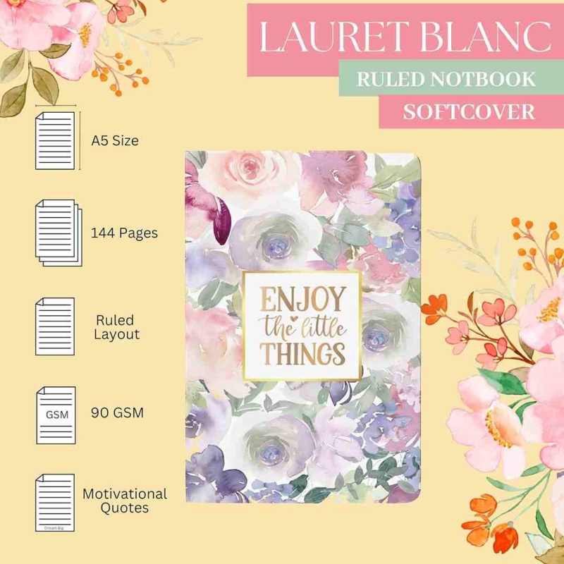 LAURET BLANC A5 Diary – 144 ruled pages on premium 90 GSM paper with motivational quotes on every page. Compact, stylish, and perfect for journaling, note-taking, or gifting.