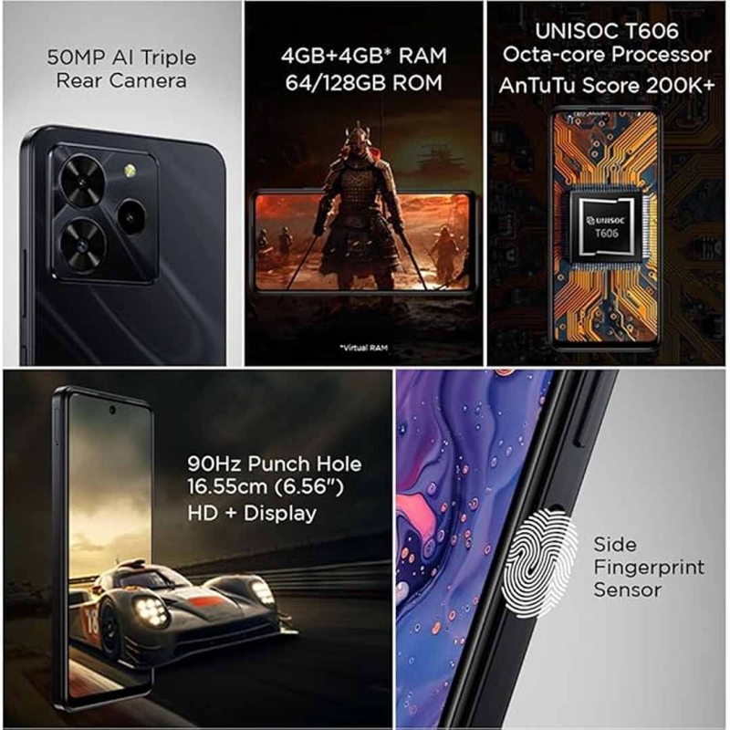 This Lava smartphone delivers smooth performance with its octa-core processor, 4GB RAM, and 4GB expandable RAM. Capture stunning photos using the 50MP AI triple rear camera and 8MP selfie camera, while enjoying clear visuals on the 6.56" HD+ display with a 90Hz refresh rate. With a long-lasting 5000mAh battery, dual SIM support, fast charging capability, face unlock, and a side fingerprint sensor, it offers a reliable, feature-rich smartphone experience for everyday use, gaming, and entertainment.