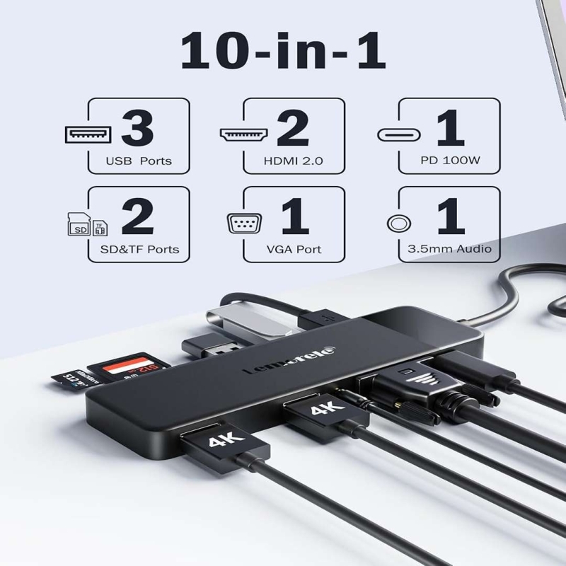 The Lemorele TC94 10-in-1 USB-C Hub is a compact, high-performance docking station designed for laptops and compatible USB-C devices. It features dual 4K HDMI, VGA, fast USB ports, SD/TF card slots, 100W PD charging, and a 3.5mm audio jack. Ideal for professionals and multitaskers, it supports triple display setups and delivers efficient data transfer and charging. Built with durable ABS & PP materials, it’s lightweight, heat-resistant, and impact-proof, making it perfect for daily use on the go.