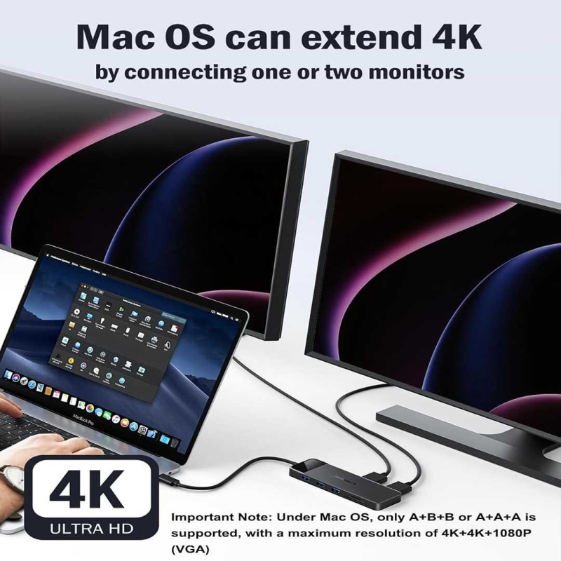 | Display Support (macOS) | A+A+A or A+B+B @4K (HDMI), VGA mirrors HDMI1 @1080P |