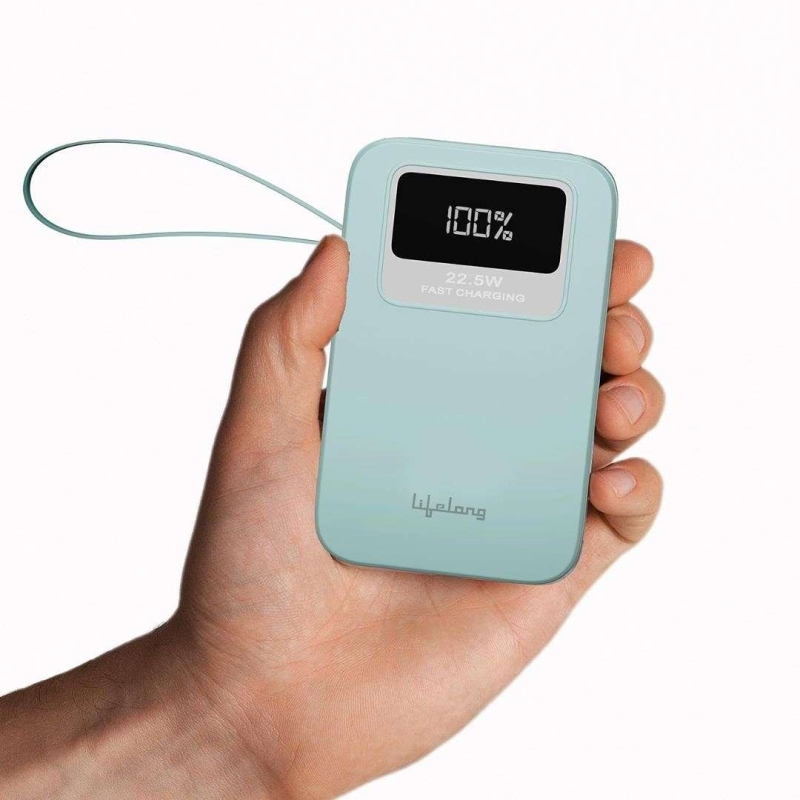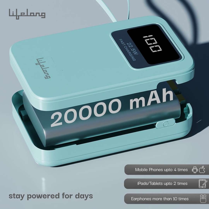 The Lifelong LLPBBWA20 Power Bank is a 20,000mAh portable charger in Blue with USB Type-C and USB-A ports, featuring fast charging up to 22.5W, a digital LED display, and a compact travel-friendly design. It is compatible with smartphones, iPhones, and iPads, and includes advanced safety protections.