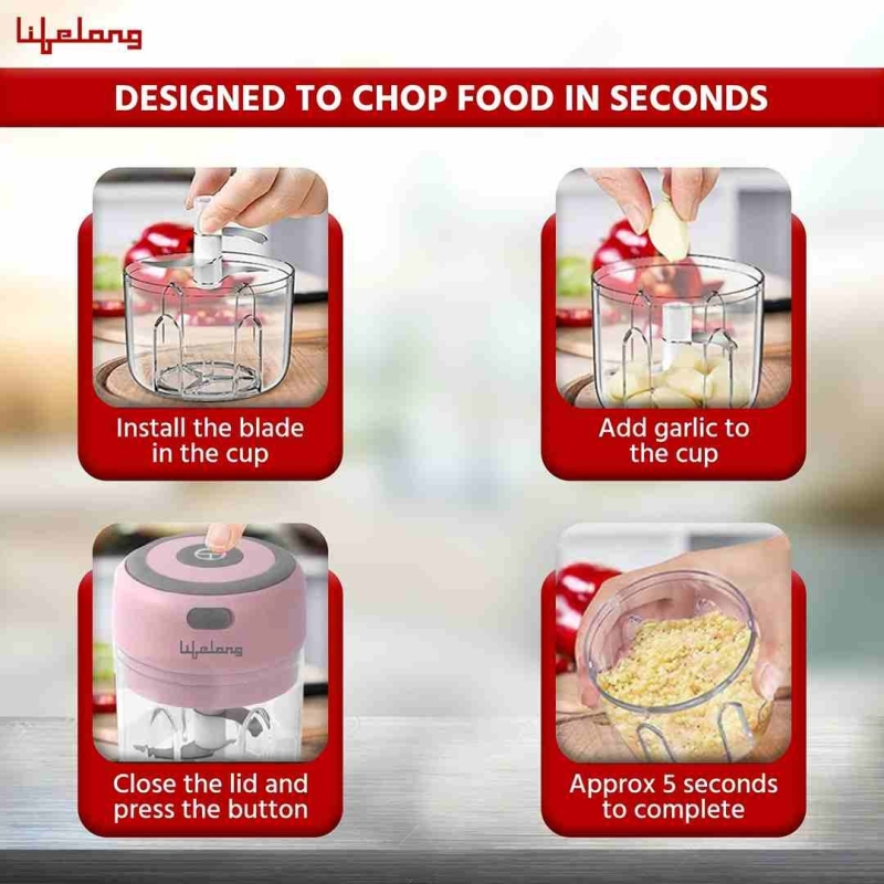 The Lifelong LLWC03 Electric Chopper is a compact, wireless kitchen essential designed for effortless chopping. With a 30W motor, sharp stainless steel blades, and USB rechargeable battery, it can easily chop onions, garlic, nuts, meat, and more. Its 250 ml capacity, portable pink design, and easy single-button operation make it ideal for daily use or travel.