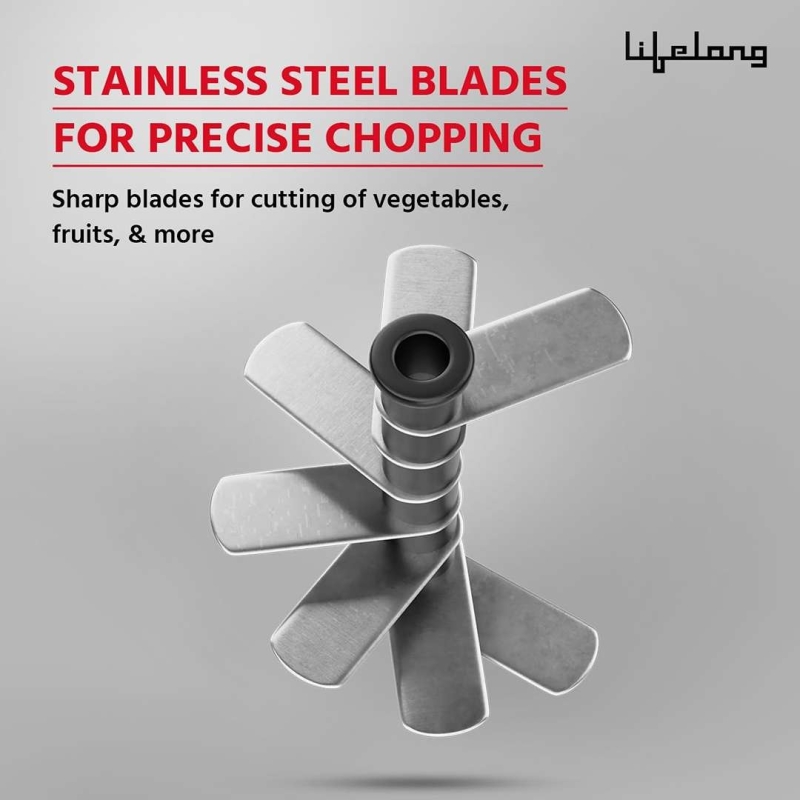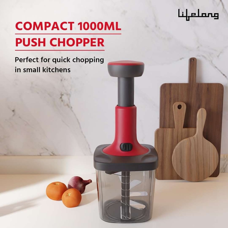 The Lifelong Push Chopper (1L) is a user-friendly manual kitchen tool designed for efficient chopping of vegetables and fruits. Featuring a safety lock, durable stainless steel blade, and 1-litre bowl capacity, it ensures mess-free and quick chopping for everyday cooking needs.