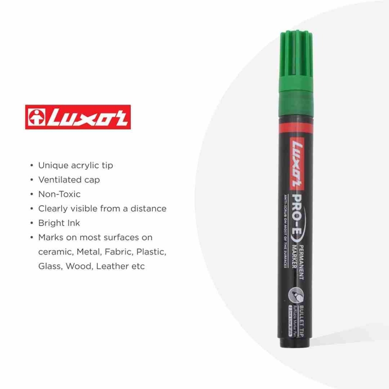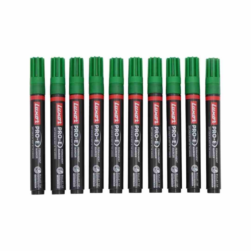 The Luxor Pro-E Refillable Permanent Markers come in a pack of 10 with fine tips and rich green ink, delivering bold and clear markings. These markers feature high-quality refillable ink, promoting sustainability and reliable performance. Ideal for office, school, or personal use, Luxor ensures eco-friendly writing solutions with trusted durability.