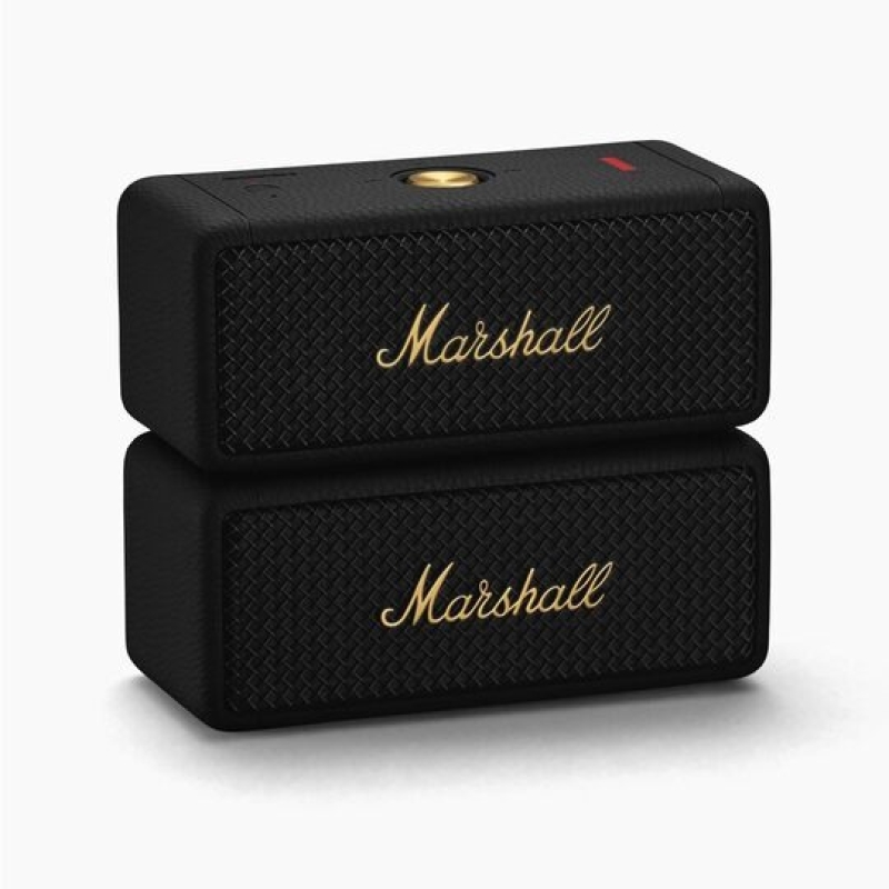 The Marshall Emberton II is a compact yet powerful portable Bluetooth speaker delivering 20W signature Marshall sound with rich stereo performance. Built for travel and parties, it offers an impressive 30+ hours of playtime, a rugged IP67 waterproof and dustproof design, and Stack Mode for connecting multiple speakers. With its iconic Black & Brass styling and eco-conscious recycled plastic build, Emberton II blends premium sound, durability, and timeless design.