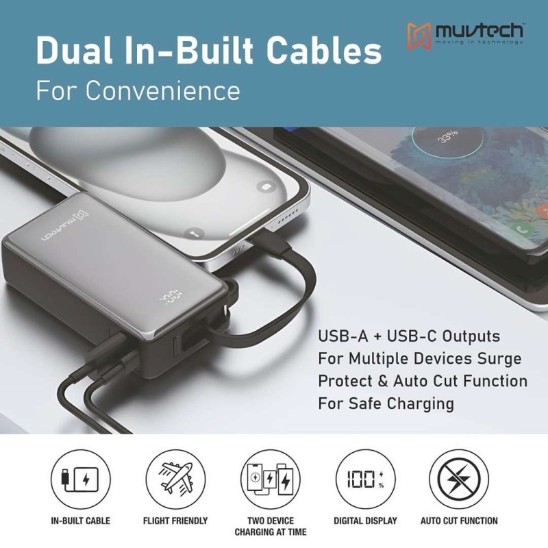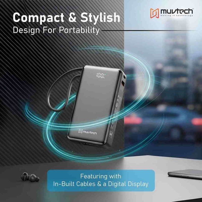 The Muvtech Mini Mate 10000mAh Powerbank is a compact, high-capacity charger with a built-in Type-C cable, dual fast-charging ports (USB-A & Type-C), and a smart LED display. It supports smartphones, tablets, laptops, and smartwatches, providing reliable power on the go.
