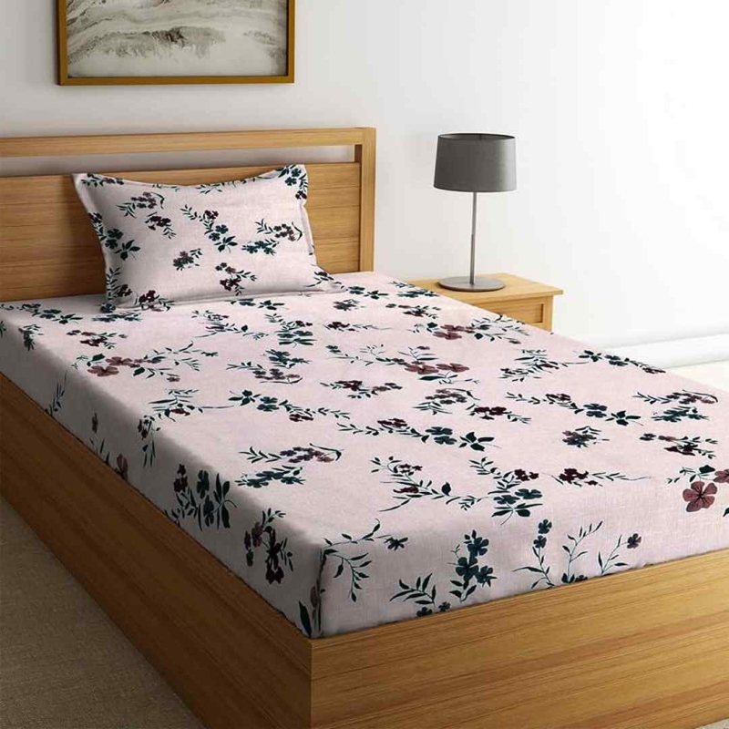 The NEW LEAF Single Cotton Bedsheet features a soft beige and green floral design that adds elegance to any bedroom. Made from breathable glace cotton with a 180 thread count, it ensures comfort all year round—keeping you cool in summer and warm in winter. This hypoallergenic, wrinkle-resistant, and durable bedsheet is perfect for everyday use and makes a thoughtful gift for housewarming or festive occasions. Includes one single bedsheet and one pillow cover.