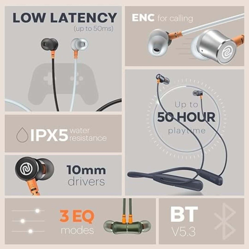 The Noise Airwave Bluetooth Neckband offers an immersive audio experience with up to 50 hours of playtime. Designed for comfort and flexibility, it features three EQ modes (Tru Bass, Tru Balance, Tru Rock) to tailor sound to your preference. With a 10mm driver and Environmental Noise Cancellation (ENC) technology, enjoy superior sound and clear calls. This sporty and elegant neckband is perfect for music, gaming, and calls, boasting low latency of up to 50ms for a lag-free experience. It’s water-resistant, sweatproof, and comes with a rechargeable battery for convenience.