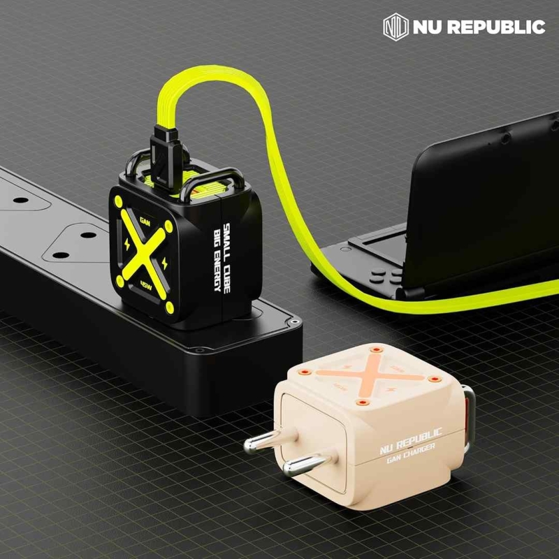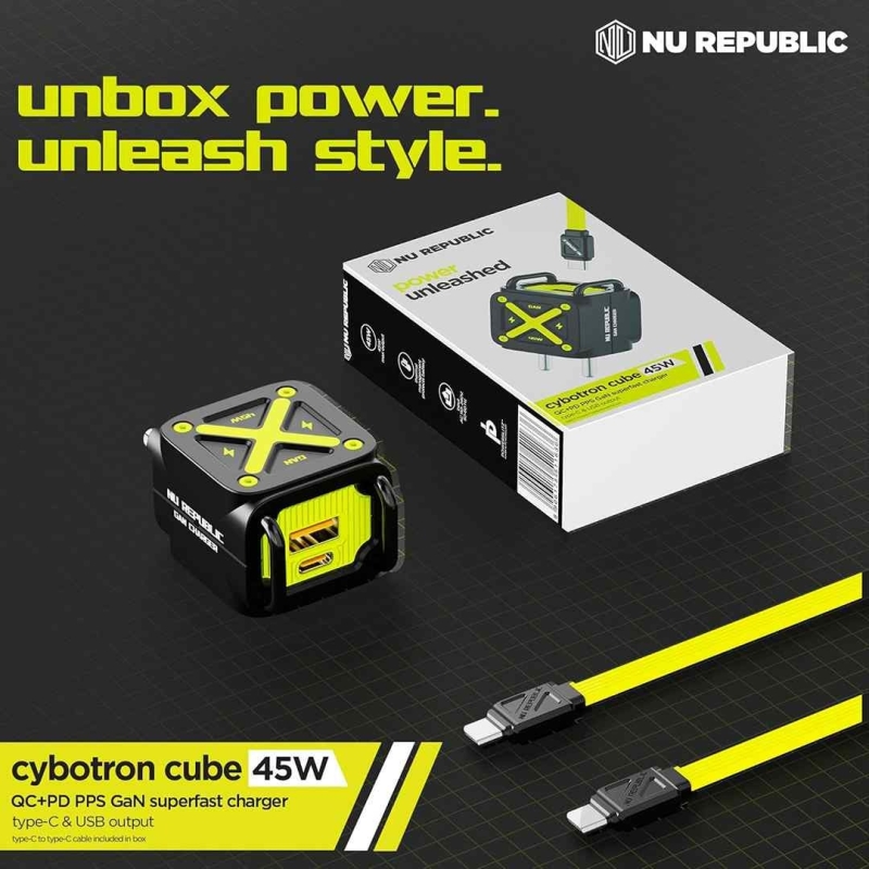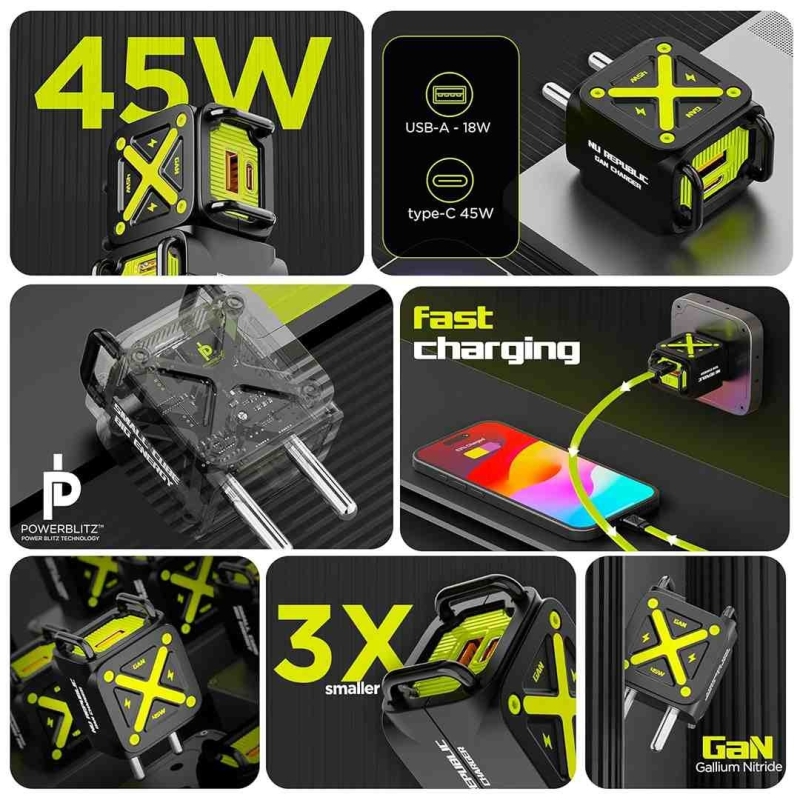 The Nu Republic 45W GaN Wall Charger is a compact and powerful charging solution designed for modern smartphones. Powered by advanced GaN technology, it delivers superfast 45W charging with support for PD, QC 3.0, and PPS, ensuring efficient and safe power delivery. With dual output ports (USB-C + USB-A), proprietary Powerblitz Technology, and built-in thermal power management, it allows you to charge multiple devices simultaneously without overheating. Its lightweight, cube-style design and included Type-C to Type-C cable make it ideal for everyday and travel use.