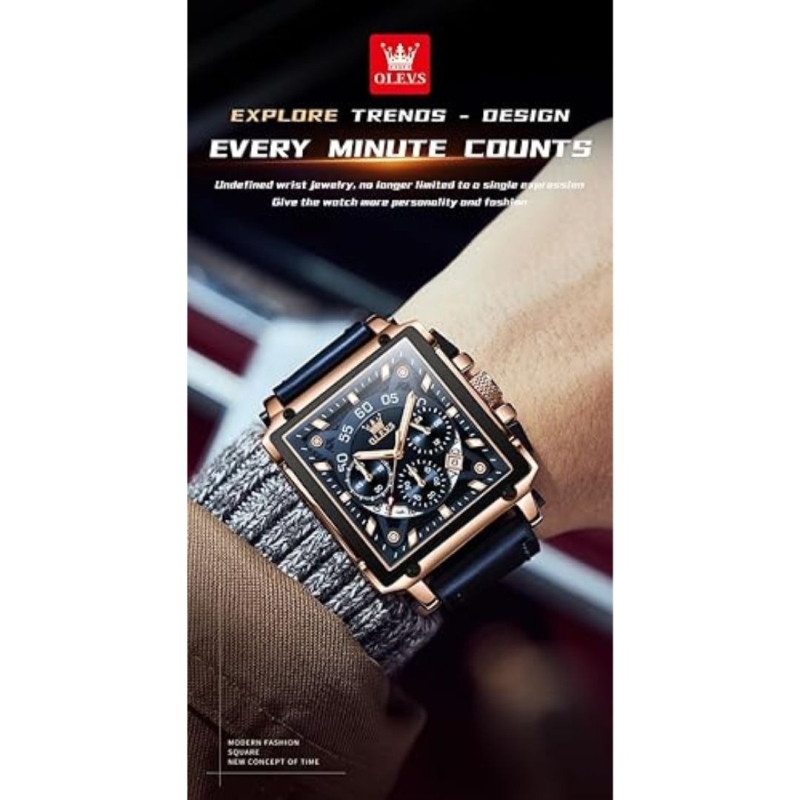 The OLEVS Men's Square Quartz Watch blends modern elegance with practical features. Featuring a stylish square dial, genuine leather strap, and multifunction chronograph, it is ideal for both business and casual settings. Powered by a reliable quartz movement, this watch offers a 2-3 year battery life, dual time display, luminous hands, and 3ATM water resistance. Whether for daily use or gifting, it comes in premium packaging—making it a perfect present for Diwali, weddings, or corporate milestones.