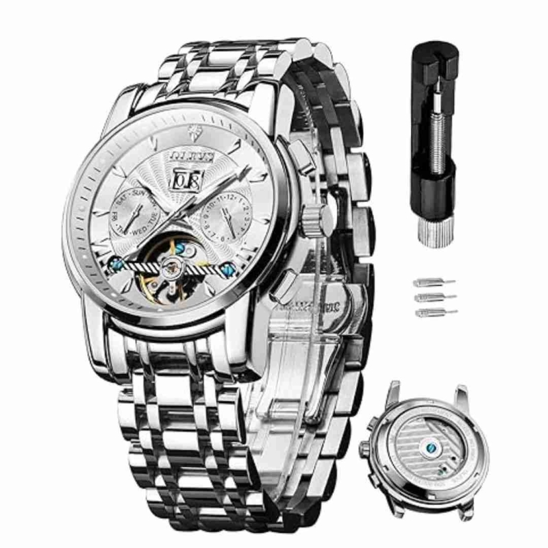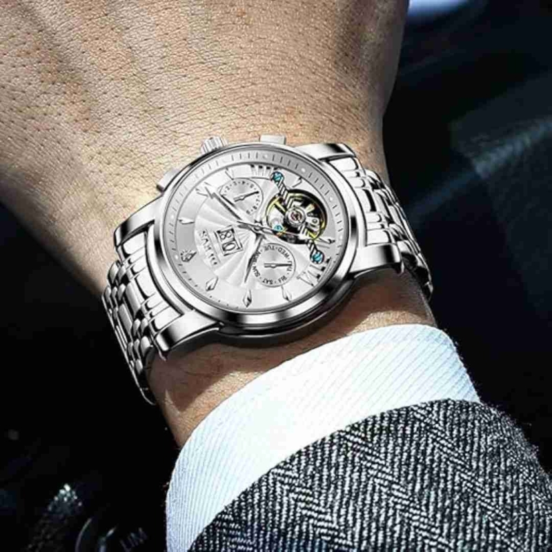 Elevate your style with the OLEVS G9965 Series – a premium automatic mechanical watch for men, crafted for those who appreciate both form and function. Featuring a bold 41mm stainless steel case, this watch showcases a skeletonized dial with classic three-hand movement, complemented by day and date displays at 3 and 9 o'clock.