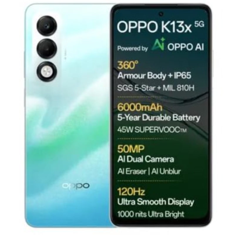 The OPPO K13x 5G in Breeze Blue is a value-packed smartphone featuring a 6.67-inch HD+ display, powerful 6000mAh battery, and Dimensity 6300 processor for smooth everyday performance. With 6GB RAM, 128GB storage (expandable up to 2TB), and a 50MP dual rear camera setup, it delivers reliable performance, long battery life, and crisp photography. Running on Android 15, this device is built for efficiency and modern 5G connectivity, making it ideal for daily use, entertainment, and multitasking.