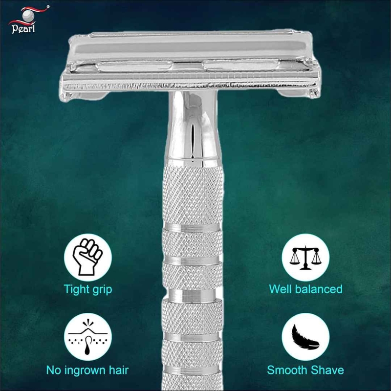 The PEARL Traditional Safety Razor is a heavy brass, single-blade razor with a butterfly head, designed for precise and comfortable shaving. Its ergonomic 4-inch handle, durable chrome finish, and travel-friendly size make it ideal for men seeking a classic, long-lasting shaving experience.