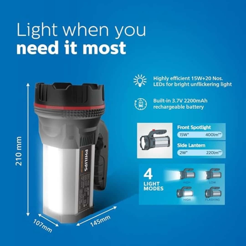 The Philips Blaze Rechargeable LED Lantern is a high-performance emergency lighting solution featuring a 400-lumen brightness, four lighting modes, and a 2200 mAh rechargeable lithium-ion battery. Designed for versatility, it offers up to 4 hours of runtime, fast charging, and multiple functional uses — all in a durable metal body. Ideal for homes, camping, or emergency use, it delivers bright, efficient lighting with easy portability.