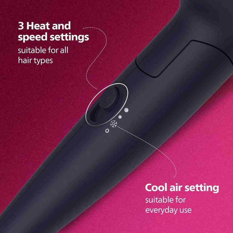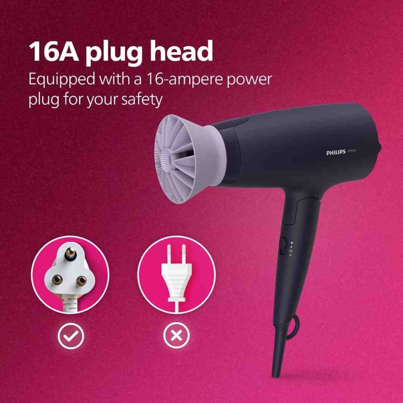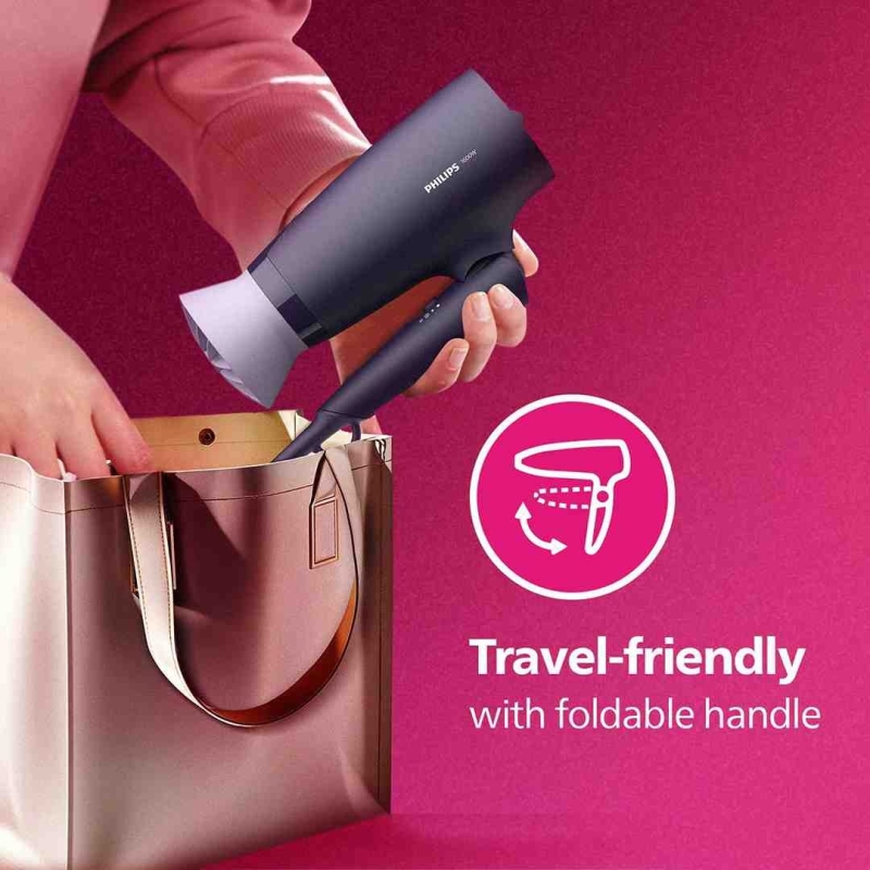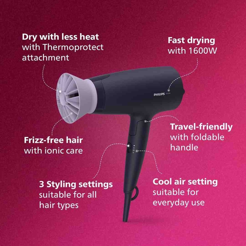 The Philips 1600W Hair Dryer combines power and care with its ionic technology that releases up to 20 million ions per session for frizz-free, glossy hair. It features 3 preselected heat/speed settings, a cool air function, and a ThermoProtect airflow system that blends warm and cool air for optimal styling. Its compact, foldable design and 1.8-meter cord make it ideal for travel and everyday use.