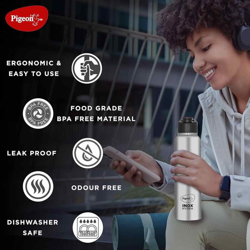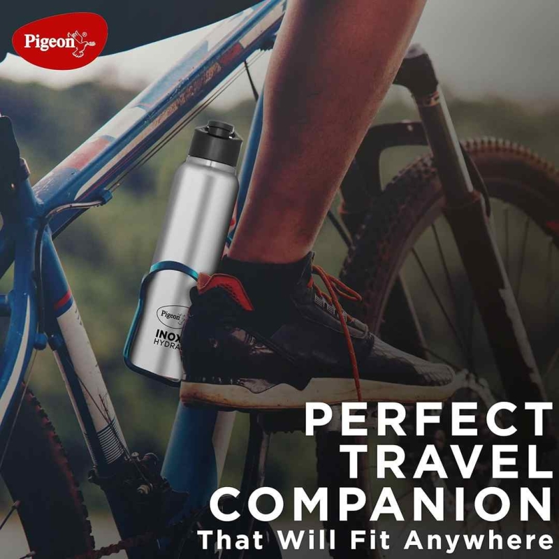 A set of two 900 ml Pigeon Inox Hydra stainless steel bottles made from high-end food-grade steel. These bottles are BPA-free, leak-proof, lightweight, and feature a wide mouth for easy filling and cleaning. Designed with a strong grip and durable build, they are perfect for hiking, travel, sports, office, and everyday hydration.