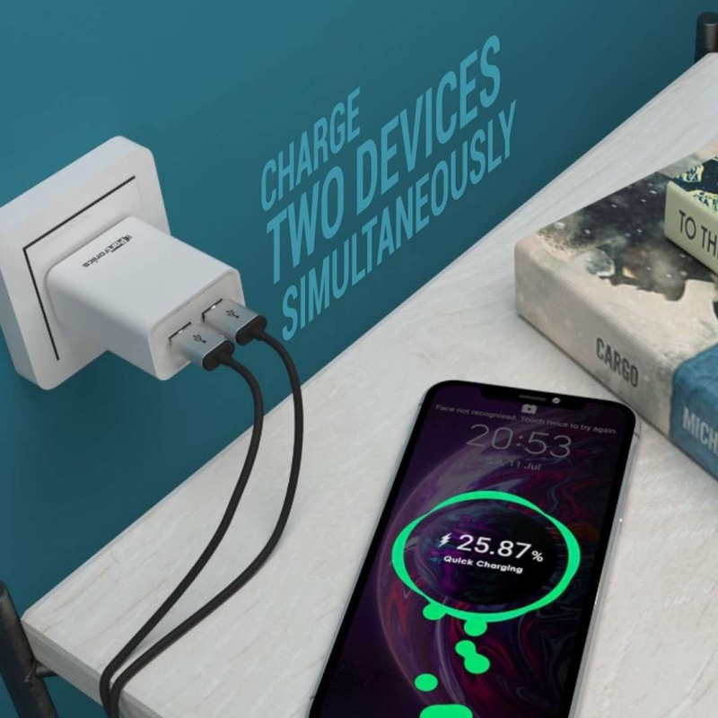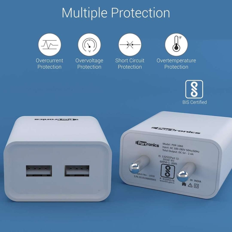 The Portronics Adapto 66 is a compact and reliable 12W dual USB wall charger designed for everyday charging needs. With 2.4A total output, it allows you to charge two devices simultaneously while ensuring safe and stable power delivery through built-in intelligent protection. BIS certified and Made in India, it comes with a 1m Micro-USB cable, making it ideal for home, office, or travel use.
