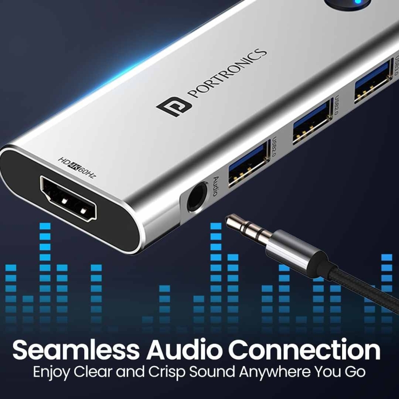 The Portronics Mport One 9-in-1 USB Hub is a powerful all-in-one connectivity solution designed for desktops and laptops. Featuring 100W Type-C Power Delivery, 4K@60Hz HDMI output with display on/off button, SuperSpeed USB 3.0, SD & microSD card reader, and a 3.5 mm audio port, it ensures seamless data transfer, stunning visuals, and efficient device charging—perfect for professionals and multitaskers.