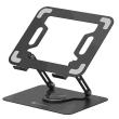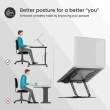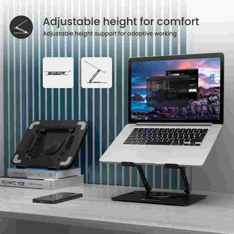 The Portronics My Buddy K9 Laptop Stand is a durable table stand designed for laptops from 10 to 17 inches. It features adjustable elevation, anti-slip silicone pads, a ventilated design for better heat dissipation, and a 360° rotating base for versatile use. Made from sturdy carbon steel, it supports up to 5 kg, offering ergonomic comfort and improved posture during long working hours.