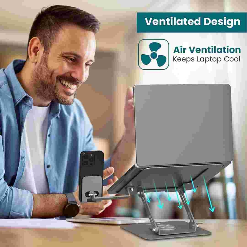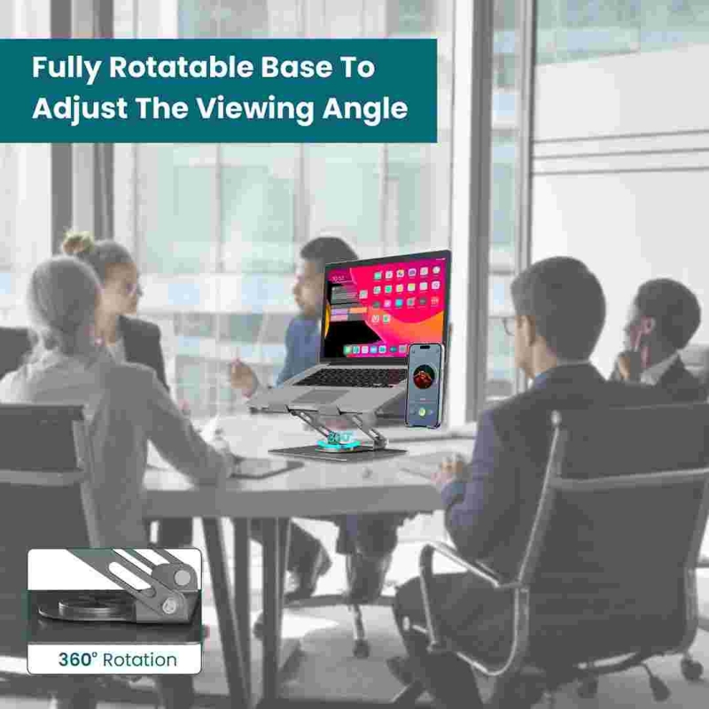 The Portronics My Buddy K9 Pro Laptop Stand (POR-3106) is a 2-in-1 laptop and phone stand designed for laptops up to 15.6 inches. It features a 360° rotating base, adjustable height and angle, a dedicated phone holder, and a ventilated metal frame for heat dissipation. The foldable design makes it portable and ideal for office, study, or travel use.