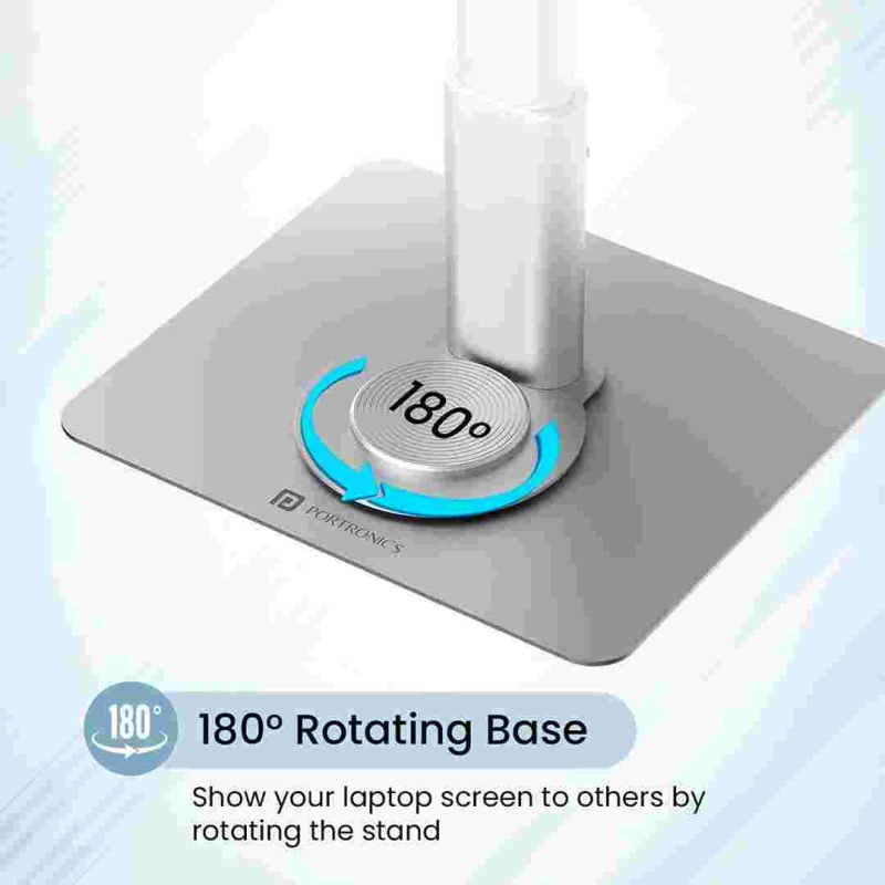 The Portronics Twister Laptop Stand (POR-2638) is a foldable, portable, and ergonomic tabletop laptop stand designed for laptops up to 15.6 inches. It features adjustable height and angle, a 180° rotatable base, ventilated design for heat dissipation, and anti-slip silicone pads for stability. Made of carbon steel alloy, it provides strong and durable support, making it ideal for home, office, or travel use.