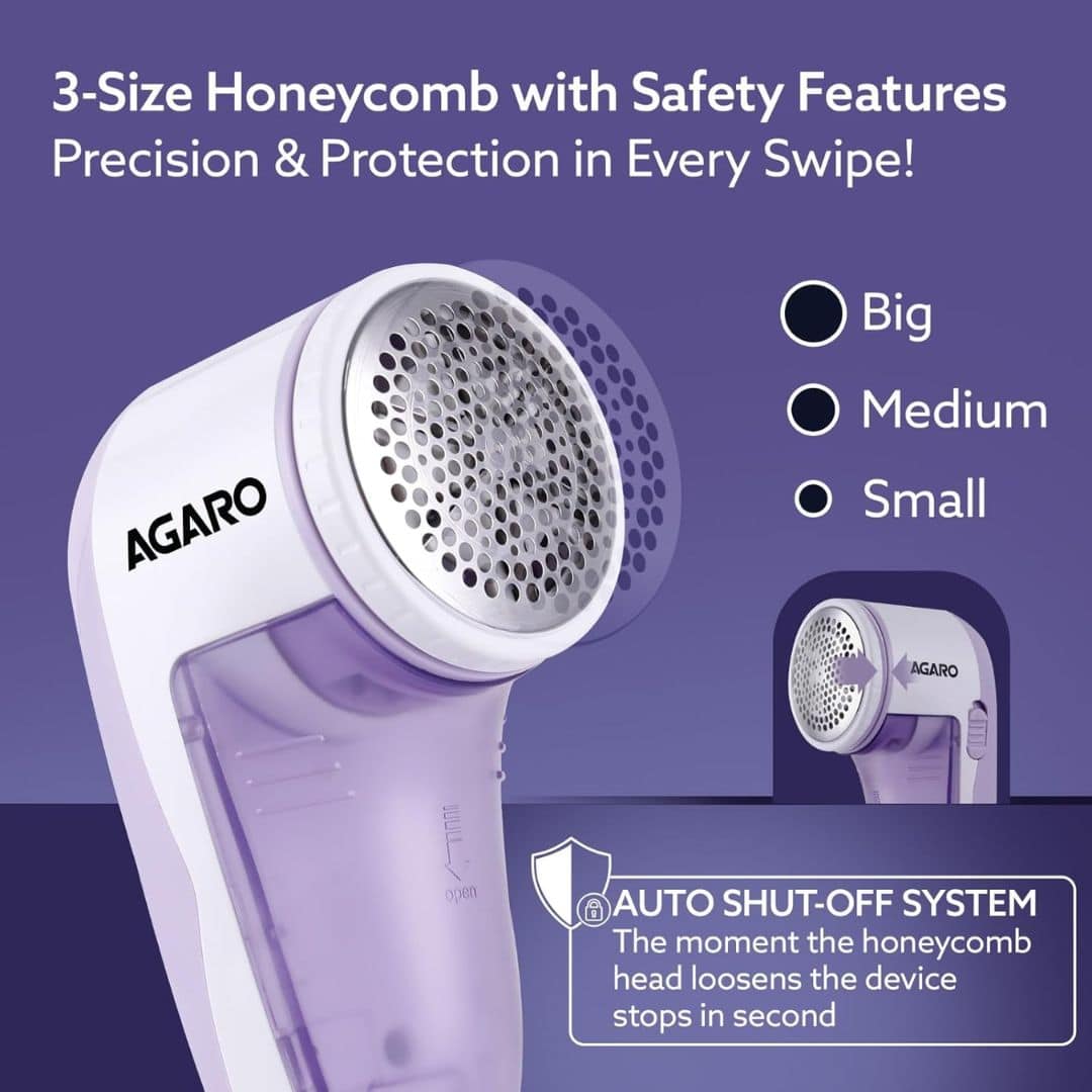 The AGARO Lint Remover is a rechargeable and automatic fabric shaver designed to effectively remove lint, fuzz, bobbles, and pills from all types of woollen garments and fabrics. It features 6-leaf stainless steel blades and a honeycomb mesh cover with variable hole sizes for efficient and safe lint removal. With up to 1 hour of usage on a 2-hour Type-C recharge, it's compact, portable, and includes a safety mechanism that prevents operation without the mesh cover.
