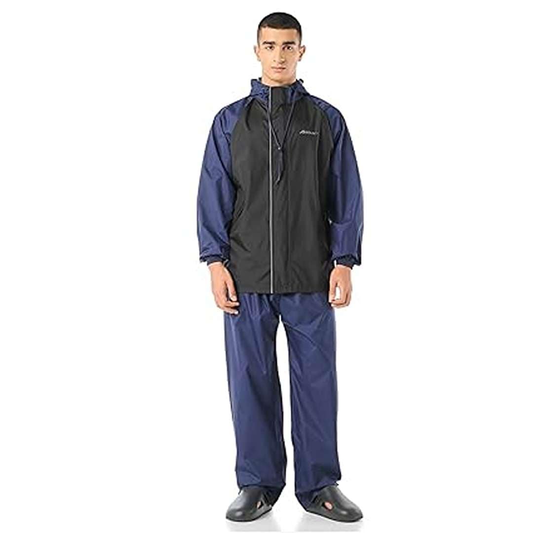 The Boldfit BFGuardian Raincoat in Navy (XL-XXL) offers superior protection during rain and windy conditions. Crafted from durable poly taffeta with PVC lining, it features a full-sleeved hooded jacket and elastic pants. With waterproof design, reflective trims, and utility pockets, it's ideal for daily commute, biking, trekking, and more.