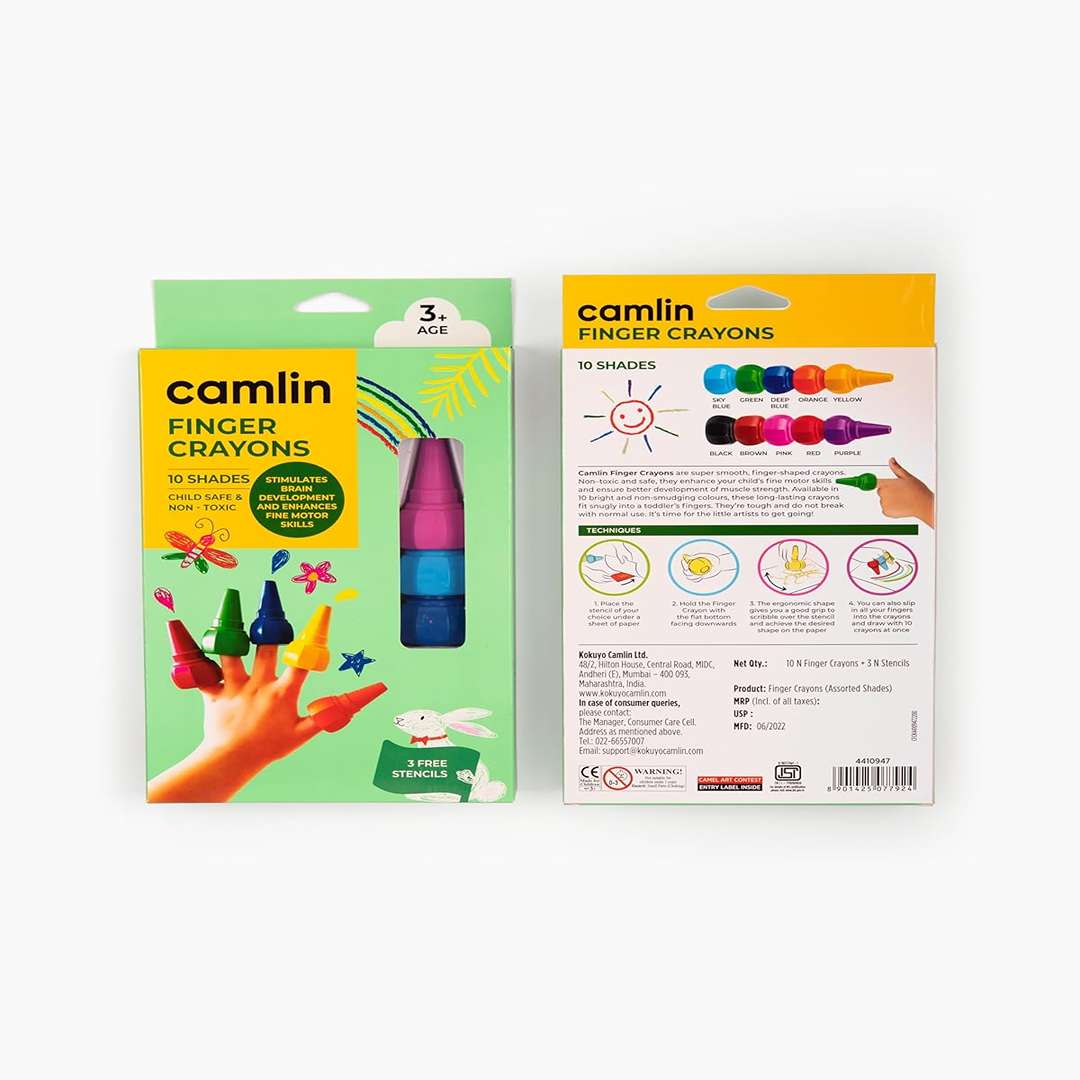 Camlin Finger Crayons are specially designed for toddlers and young kids, featuring a unique finger-shaped design that ensures a comfortable grip for little hands. Made from non-toxic, child-safe materials, these break-resistant crayons come in 10 bright, non-smudging colors and include 3 fun stencils to inspire creativity. Ideal for early learners and safe for everyday use.