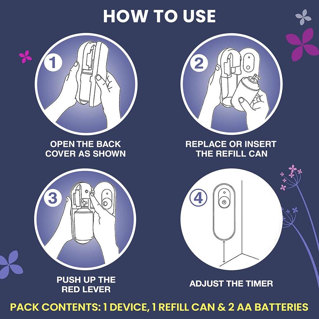 The Godrej aer Matic Violet Valley Bloom is a battery-operated automatic room freshener designed to keep your home fragrant 24x7. With a refreshing violet scent, each 210 ml refill delivers up to 2,200 sprays and lasts for up to 60 days. Featuring flexible spray intervals (10, 20, or 40 minutes), this air freshener can be wall-mounted or placed on a shelf, making it ideal for any room. The kit includes 1 automatic spray machine and 1 refill.