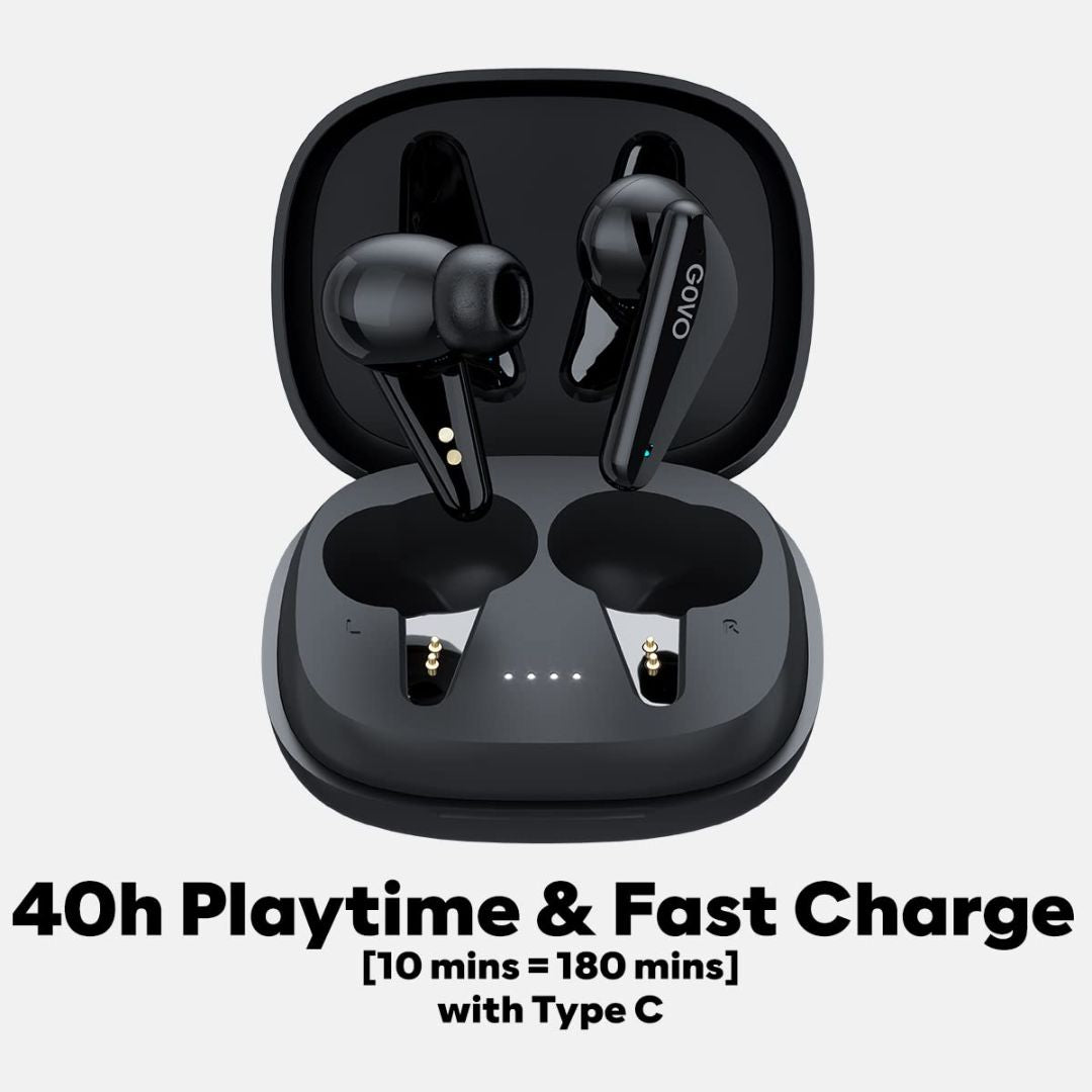 Experience immersive sound and long-lasting performance with the GOVO GOBUDS 600 earbuds in Platinum Black. Enjoy up to 40 hours of playtime, including 7 hours on a single charge and 33 hours via the compact charging case. Fast charging gives you 180 minutes of playback with just 10 minutes of charge. Featuring powerful bass with 3D surround sound, low latency (60–80ms) for seamless gaming, and Bluetooth 5.2 for stable connectivity. With IPX5 water resistance, ENC for crystal-clear calls, voice assistant support, and an LED battery indicator, the GOBUDS 600 is built for non-stop entertainment—anytime, anywhere. NOT RETURNABLE