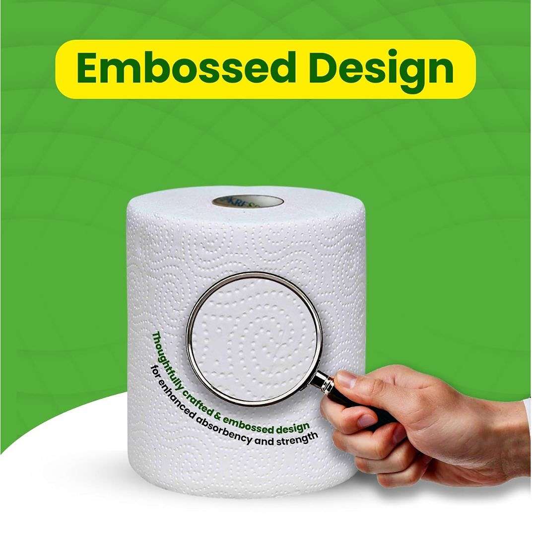 KRESSA offers high-quality, soft, and hygienic 2-ply jumbo paper towels made from 100% natural virgin pulp. Free from optical brightening agents (OBA-Free) and biodegradable, these towels are safe for food contact and versatile for kitchen, bathroom, floor cleaning, and mealtime use. Each pack includes 2 dispenser-friendly rolls with 300 sheets each (19.6 cm x 20 cm).