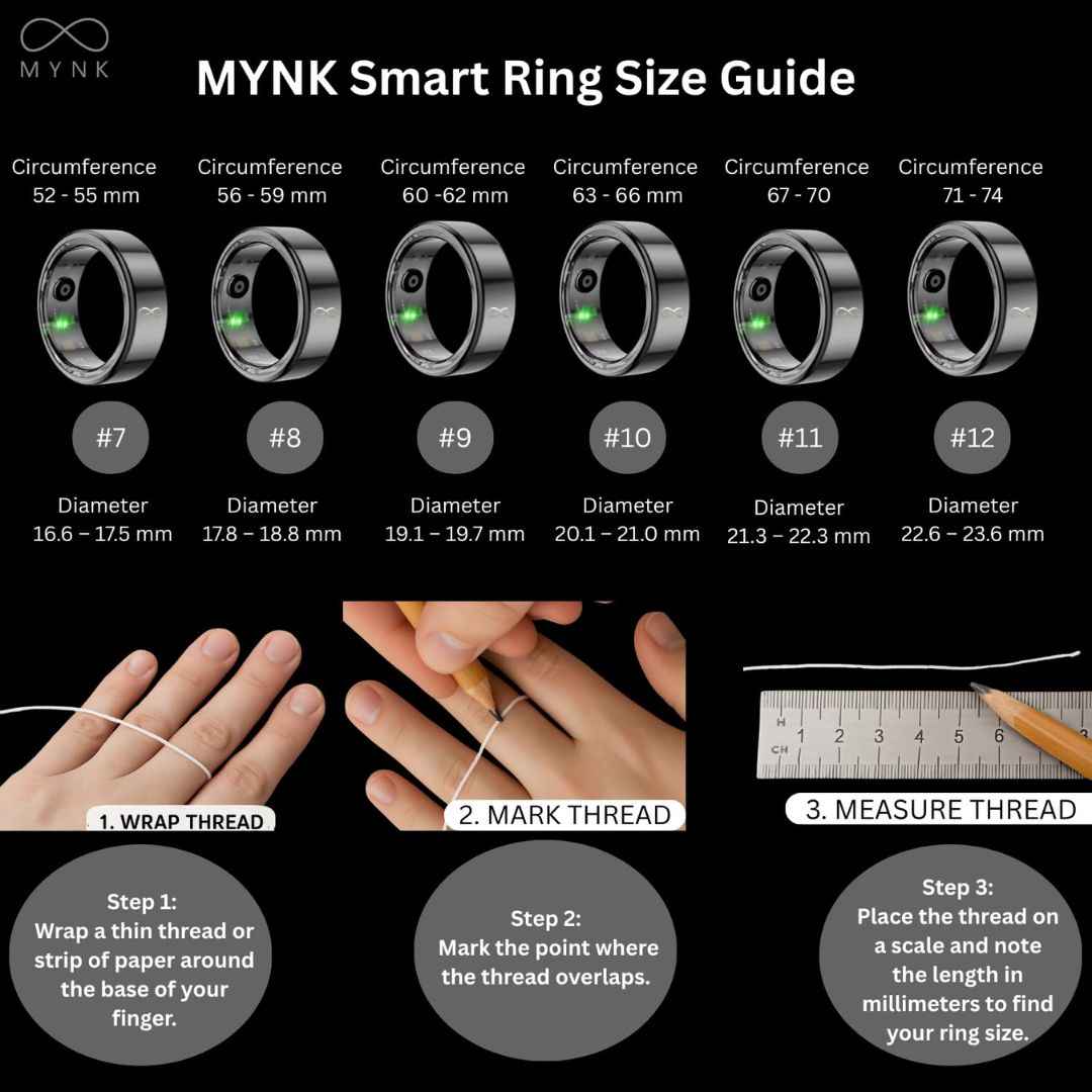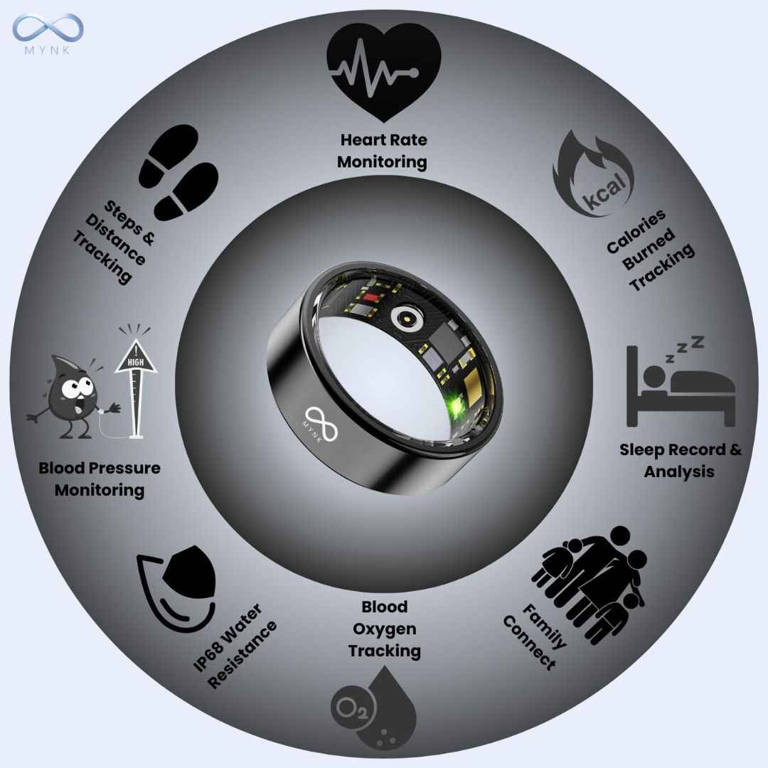 MYNK Smart Ring is a compact, stylish wearable designed for all-day health and fitness tracking. Engineered with advanced sensors, it monitors heart rate, HRV, SpO₂, sleep stages, stress levels, and calorie burn. Built from durable stainless steel, it features a minimalist design suitable for both men and women. With IP68 waterproofing, up to 6-day battery life, and compatibility with Android & iOS devices, the MYNK Ring is your all-in-one wellness companion.
