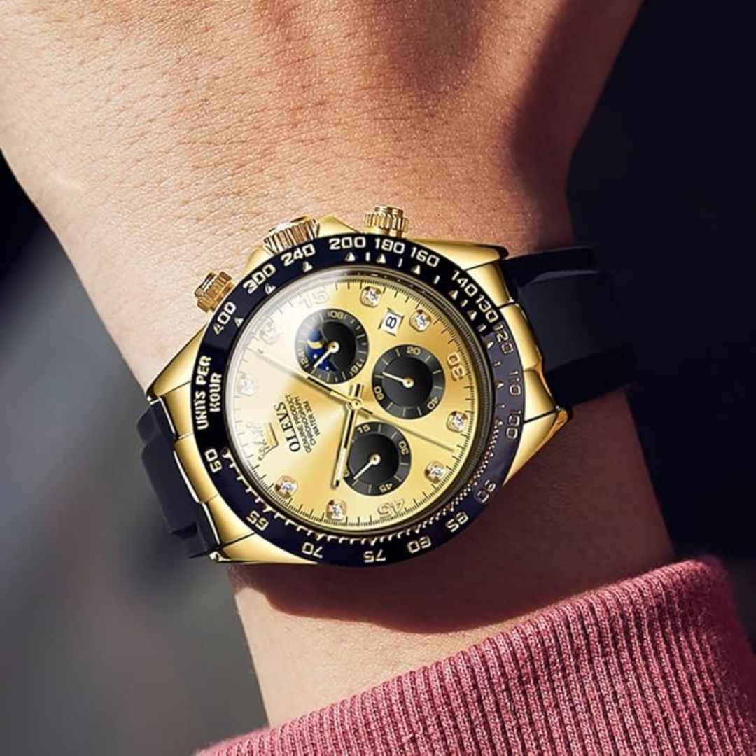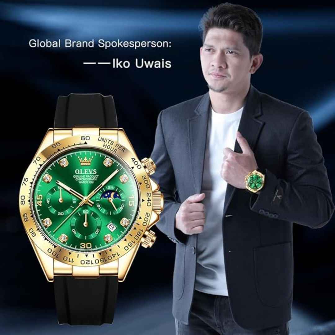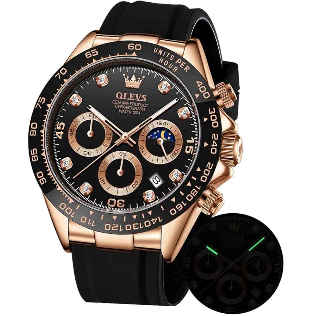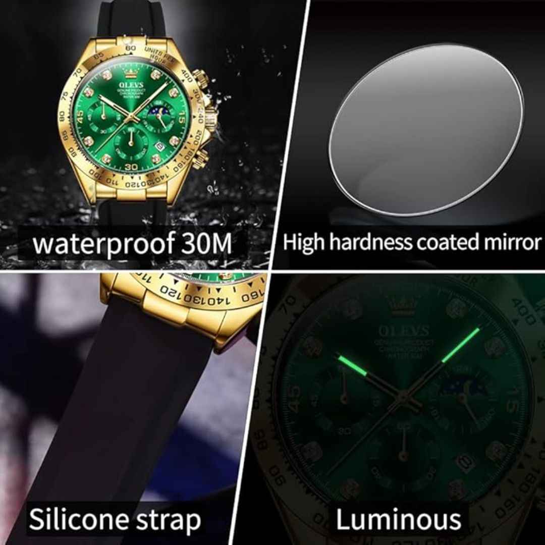 The OLEVS MJ-IND-G2875 collection blends elegance, durability, and functionality. Featuring a 41.5mm case, Japanese Quartz movement, luminous hands, moonphase subdial, and a premium silicone strap, this timepiece is perfect for modern men. All variants come in a luxury gift box.