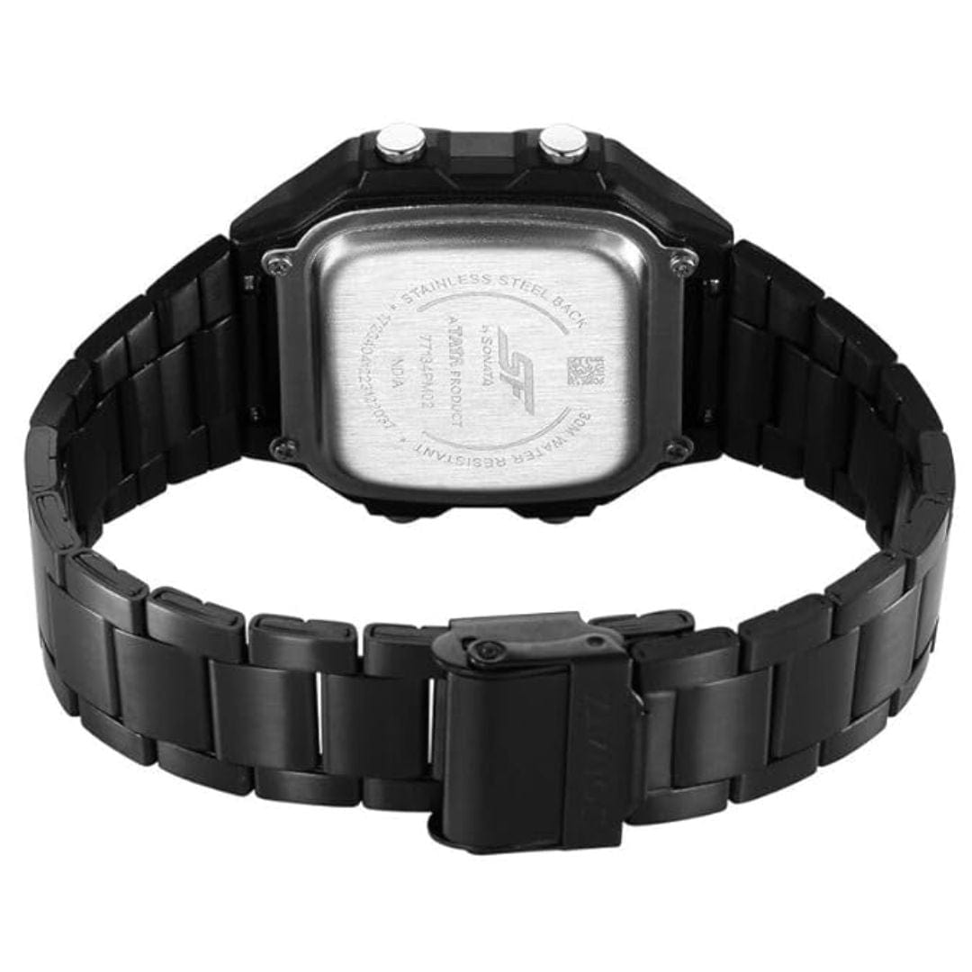 The Sonata 77134PM02W Casual Watch is a stylish unisex timepiece featuring a 41.6 mm round plastic case with a black stainless-steel band and a sleek black digital dial. Powered by a quartz movement, it offers a durable design with 30 meters water resistance, a push-button deployment clasp, and a 1-year warranty, making it perfect for everyday casual wear.