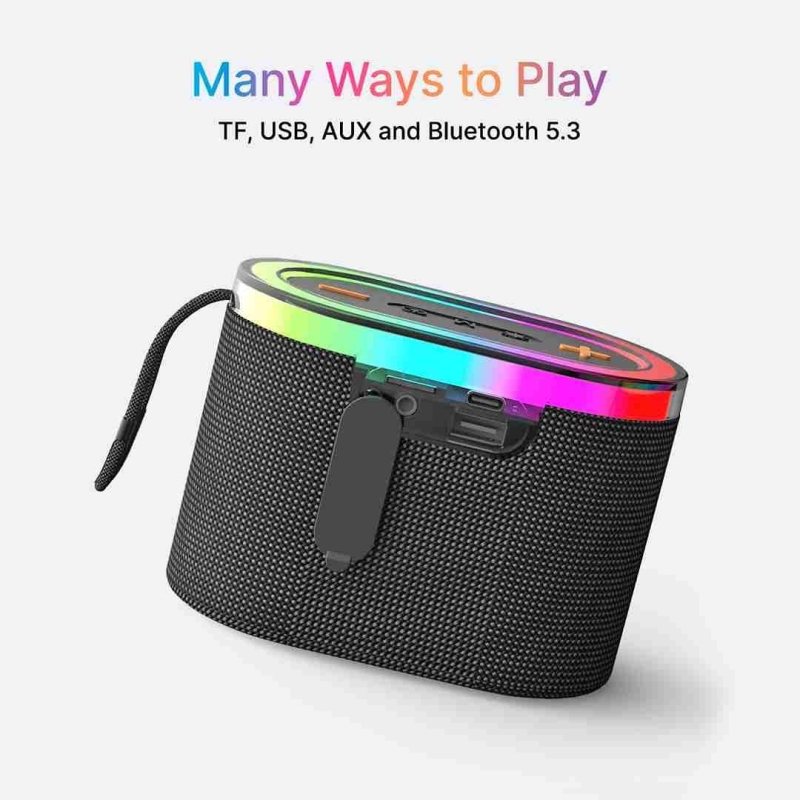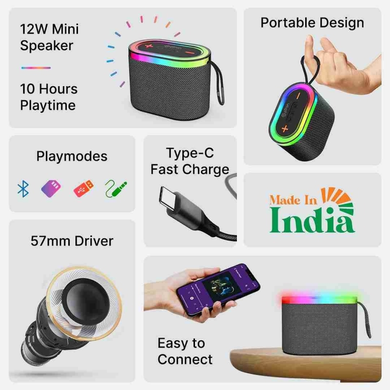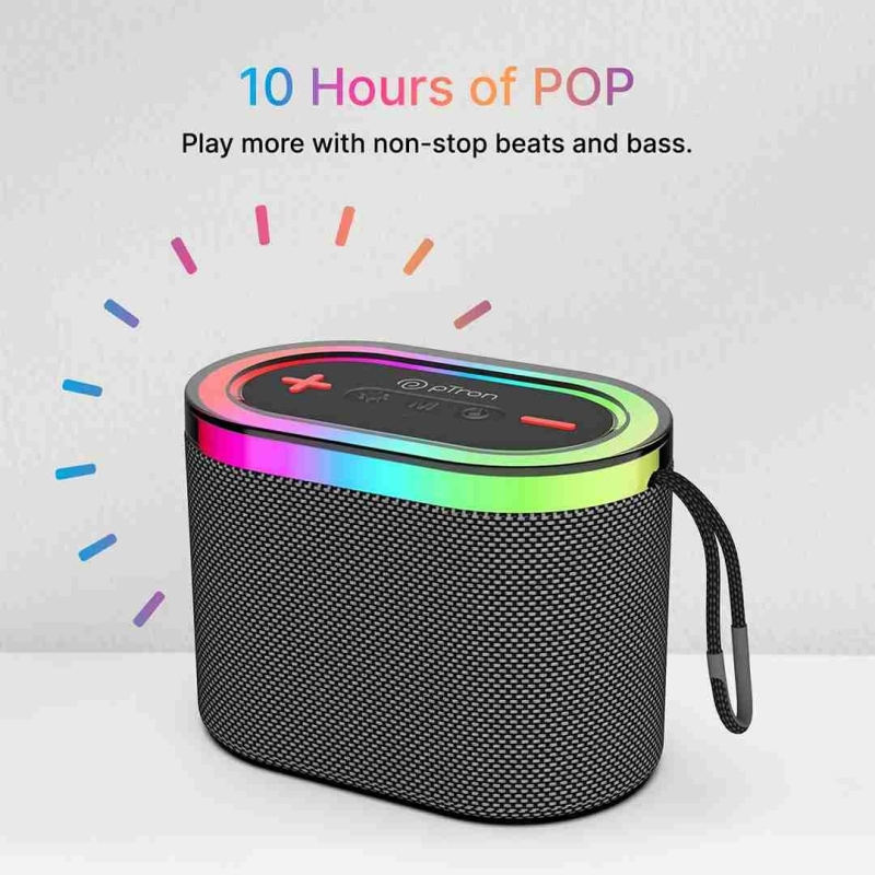 The pTron Fusion Pop is a compact and lightweight 12W portable Bluetooth speaker designed for immersive everyday listening. Powered by a 57mm Neo driver, it delivers balanced sound with punchy bass, enhanced by rhythmic RGB lights for an engaging audio-visual experience. With Bluetooth 5.3, multiple playback options, TWS pairing, and up to 10 hours of playtime, it’s ideal for parties, travel, and indoor or outdoor use.