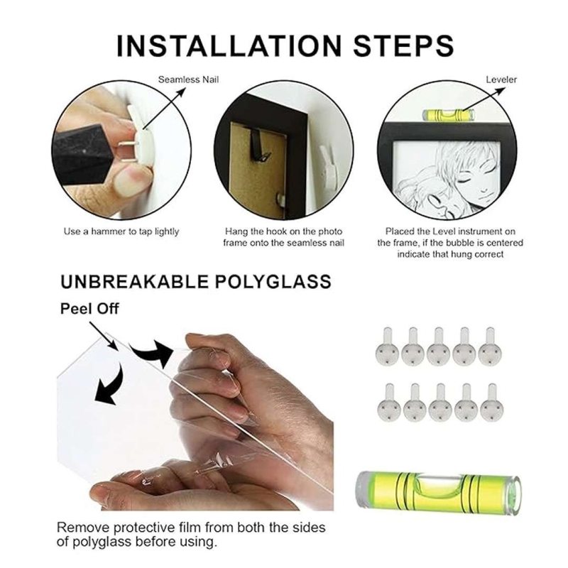 | Included Items | Bubble Level, No-Trace Nails, Mount Boards, Installation Guide, Photo Frames |