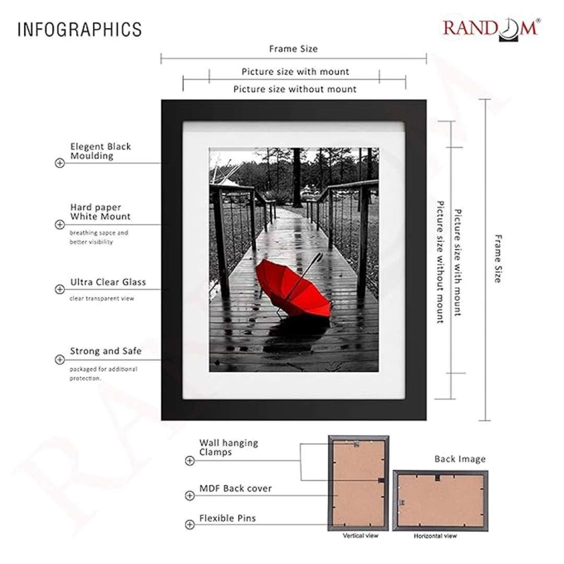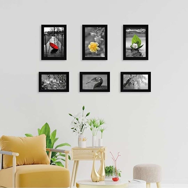 Create a stunning wall display with the RANDOM Black and White Photo Frame Set. This set of 6 frames allows you to personalize your space with family portraits, artwork, or landscape photos. Designed for easy assembly, the frames come with a locker on the back for quick picture replacement and a Plexi Glass cover for effortless cleaning. Suitable for vertical or horizontal mounting, these modern engineered wood frames add a stylish touch to any room. A perfect gift for special occasions like weddings, housewarmings, and anniversaries.