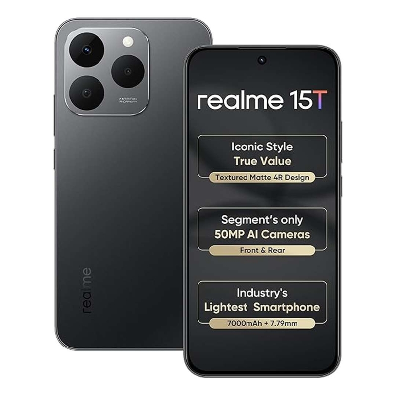 The realme 15T 5G is a performance-focused smartphone featuring a 6.67-inch 120Hz AMOLED display, the Dimensity 6400 Max 5G processor, and a massive 7000mAh battery with 60W fast charging. Equipped with dual 50MP cameras, IP69 protection, and Face Recognition security, it delivers smooth multitasking, long battery life, and durability suited for everyday Indian conditions.