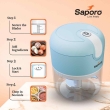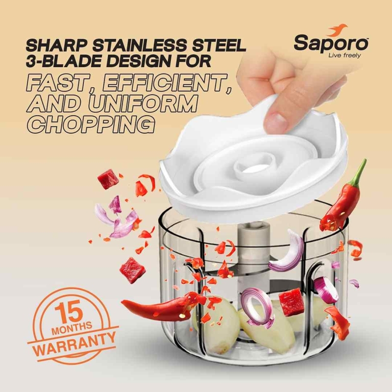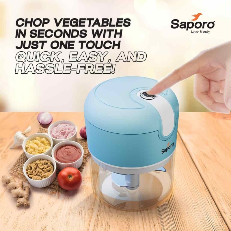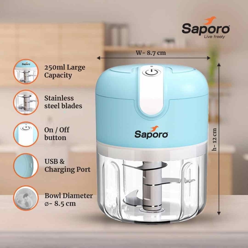 The Saporo Strike Mini Chopper is a powerful and portable kitchen helper with a 30W motor, one-touch operation, and 3 sharp stainless steel blades. With its 250 ml capacity, USB rechargeable battery, and compact anti-skid design, it is ideal for chopping onions, garlic, nuts, meat, and more. Perfect for quick, cordless food prep, both at home and on the go.