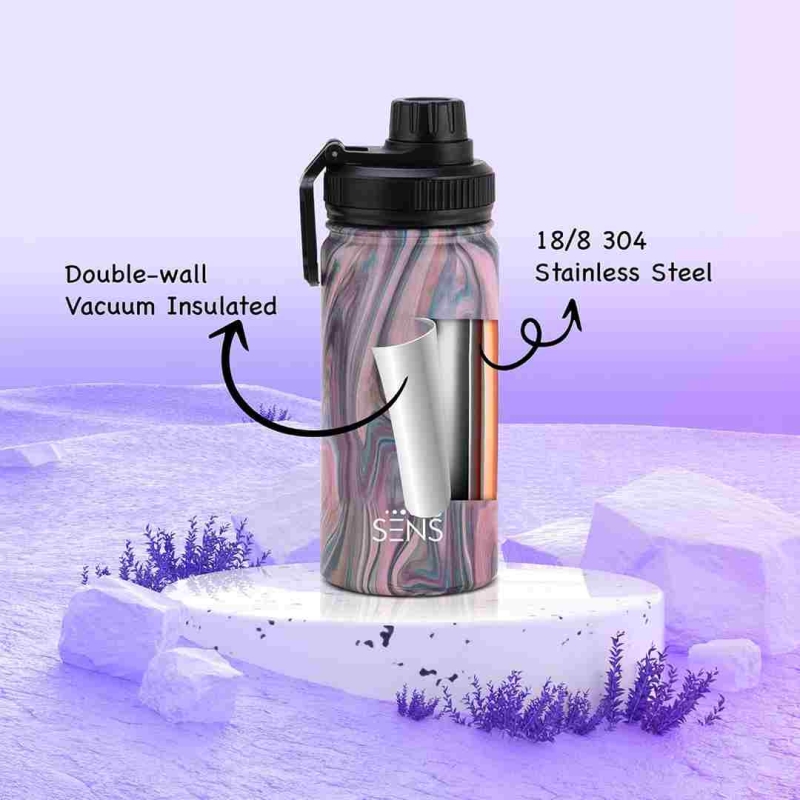 he SENS Hydra Twist 500ml insulated bottle is made from premium 304 stainless steel with a double-wall vacuum design, keeping drinks cold for up to 24 hours and hot for up to 12 hours. Featuring a leakproof screw cap, BPA-free construction, and a stylish Escape marble finish, it is perfect for coffee, tea, water, and soup. Lightweight, durable, and rust-resistant—ideal for daily use, sports, and travel.