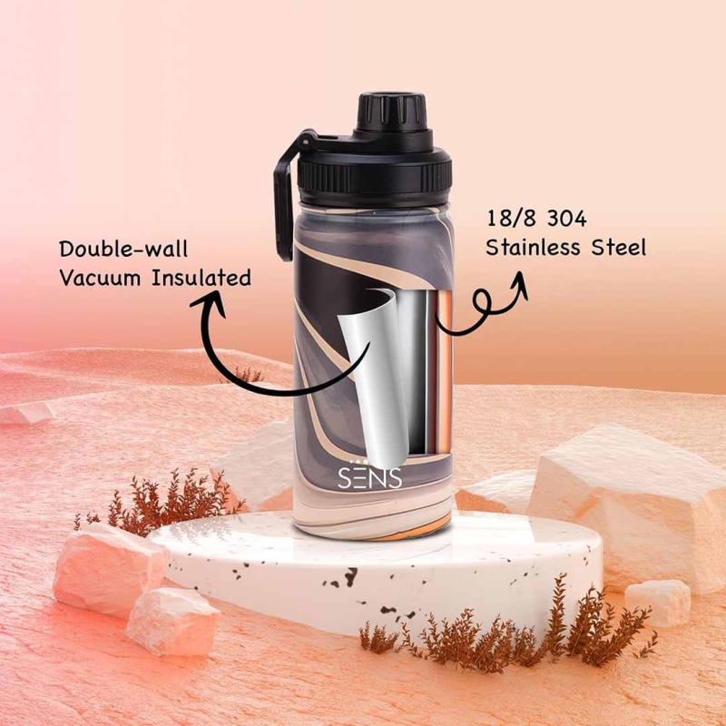 The SENS Hydra Twist 500ml bottle is made from premium 304 stainless steel with double-wall vacuum insulation that keeps beverages cold for up to 24 hours and hot for up to 12 hours. Its leakproof screw cap, BPA-free construction, and stylish Nebula marble finish make it ideal for coffee, tea, water, or soup. Durable, rust-resistant, and lightweight, perfect for daily use, travel, sports, and outdoor activities.