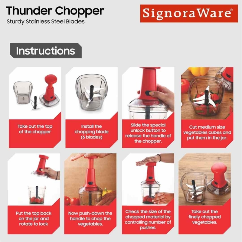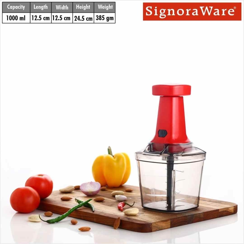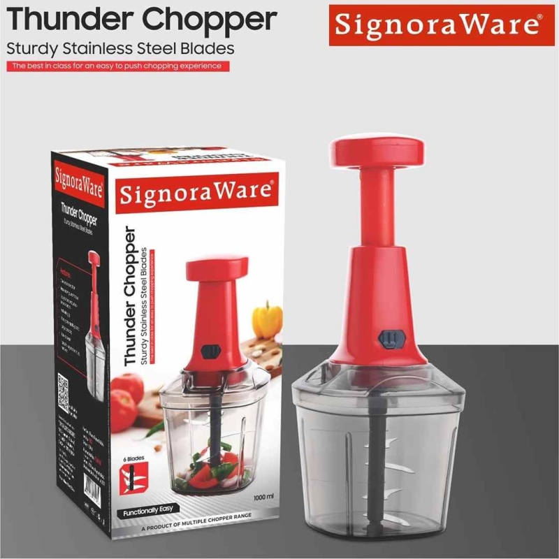 The Signora Ware Thunder Chopper 1000 ml is a manual multipurpose chopper ideal for chopping vegetables, fruits, and dry ingredients. With a large 1-litre capacity, it's perfect for everyday kitchen tasks. Designed with user convenience in mind, it's compact, colorful, and easy to maintain.