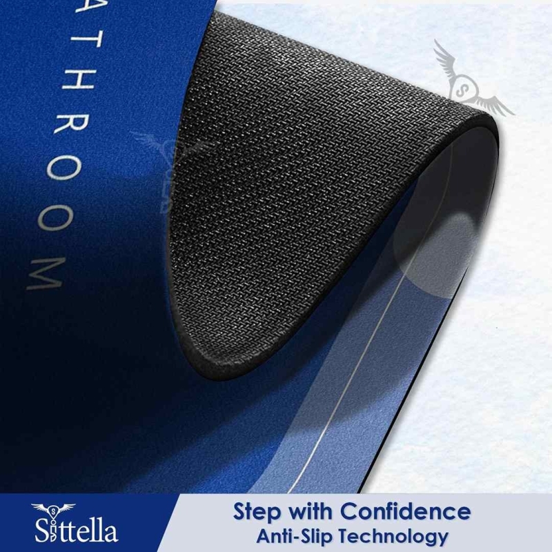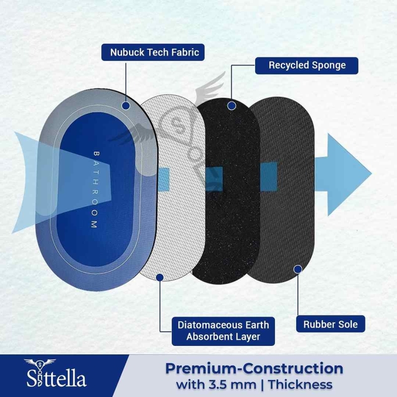 The SITTELLA Rubber Bath Mat is a durable, quick-drying, and non-slip mat designed for both indoor and outdoor use. Made with a 4-layer construction—including a soft nubuck fabric top, diatomaceous earth layer for rapid water absorption, a cushioning sponge layer, and a non-slip rubber bottom—it ensures maximum safety and comfort. It is stain-resistant, machine-washable, waterproof, and ideal for bathrooms and wet areas. The mat measures 60 x 40 cm, comes in a light blue color, and features a classic oval design.